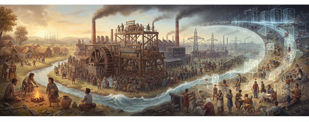 شواهد تاریخی نشان میدهد که حدود یک قرن (از دهه ۱۷۷۰ تا ۱۸۷۰)، دستمزدهای واقعی کارگران بریتانیایی تقریباً ثابت ماند یا حتی کاهش یافت، در حالی که بهرهوری به شدت افزایش یافت. این بازه زمانی که اقتصاددانان به آن «فاصله انگلز» میگویند، دقیقاً همان دورهای است که تکنولوژی در خدمت جایگزینی انسان بود و نهادهای اجتماعی (اتحادیهها، حق رأی) آن قدرت نداشتند تا سهمی از این سود را برای کارگران بگیرند.